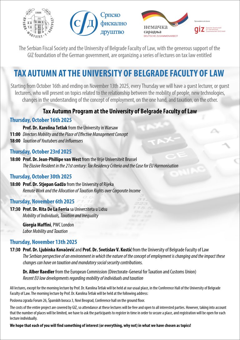 The Serbian Fiscal Society in cooperation with the University of Belgrade Faculty of Law and with the support of the Deutsche Gesellschaft für Internationale Zusammenarbeit (GIZ) GmbH under our joint initiative