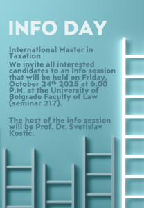 We hereby invite you to an information session intended for both candidates interested in this study program and employers who may see this as an opportunity to develop the competencies of their staff in the field of taxation. The info session will be held on Friday, October 24, 2025 at 6:00 PM at the Faculty of Law, University of Belgrade, Blvd. kralja Aleksandra 67, seminar 217. At the info session, attendees will be introduced to the program by Prof. Svetislav Kostić from the Faculty of Law, who will answer questions from attendees after the introductory remarks.