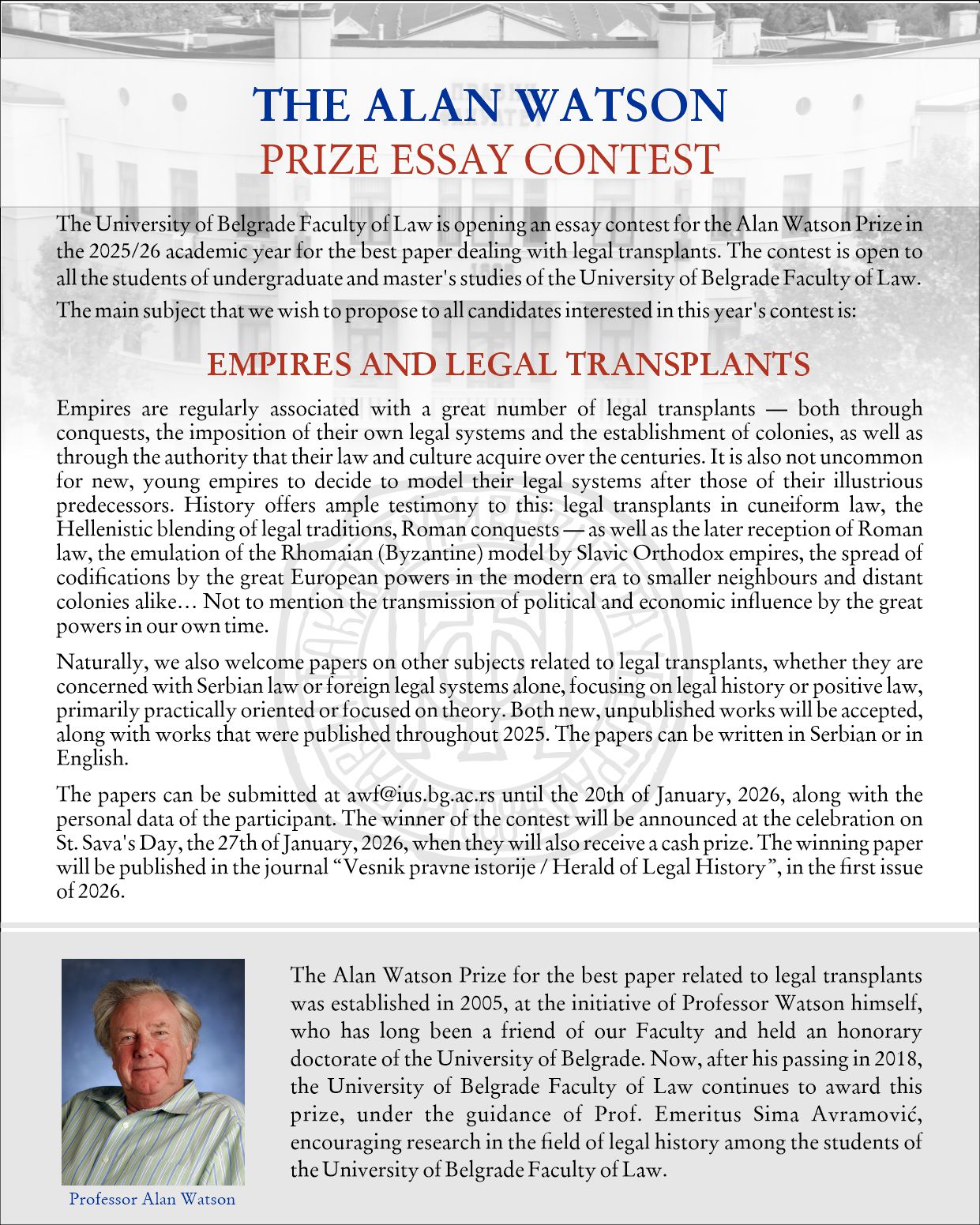 The University of Belgrade Faculty of Law is opening an essay contest for the Alan Watson Prize in the 2025/26 academic year for the best paper dealing with legal transplants. The contest is open to all the students of undergraduate and master’s studies of the University of Belgrade Faculty of Law.